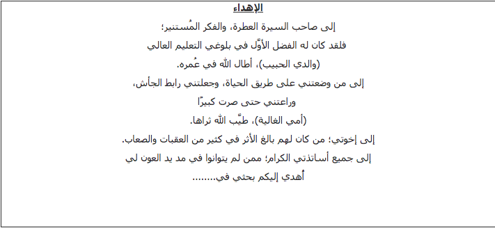 2. تتراوح عدد كلمات الاهداء ما بين 60-100 كلمة فلا يجب ان يتجاوز هذا العدد من الكلمات وان يدرج في صفحة واحدة.