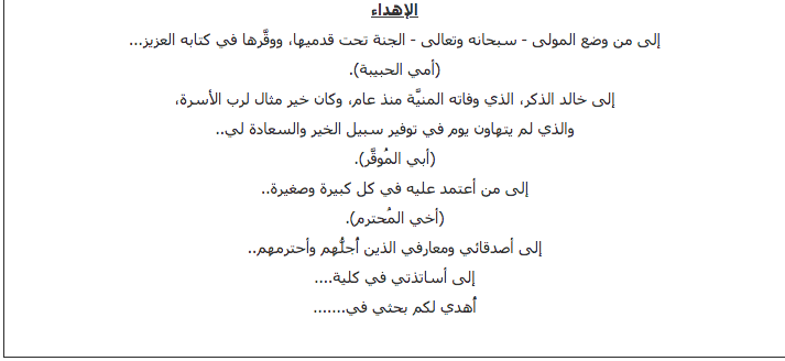 3. الاهداء يوجه للاشخاص المقربين بك دائما يجب البدئ بالابوين فالزوجة والاخوة ثم الاساتذة وكل ما ساهم في انجاز البحث.